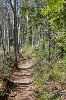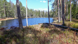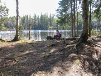 Matka jatkui kohti Piilolampea. Matkan varrella ihastelimme useiden lintujen soidinlaulua ja pyrimme tunnistamaan siten eri lajeja. Havaintoja tehtiin myös kyykäärmeestä ja vesiliskosta. Ryhmä pieniä partiopoikia suurine varustepakkauksineen tuli jossakin välissä meitä vastaan. Tavoitteena heillä lienee ollut Kiiskilampi. Poikkesimme Piilolammen tielle tultuamme reitiltä hiukan. Tiellä kulkemisen sijasta nousimme lammen pohjoispäähän johtavalle polulle. Ihastuksen huokauksia kuului joukostamme päästyämme ylös kallioille. Kuuntelimme tuulen huminaa ja päättelimme olevamme keskellä suomalaista kansallismaisemaa.