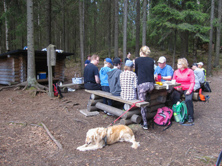 Latu-Miilussa osa porukasta tyytyi omiin eväisiin, kun taas toiset kävivät kanttiinissa hakemassa tuhdin muona-annoksen. Petteri apulaisineen oli taas pistänyt parastaan, vaikkei tällä kertaa ulkotulille päässytkään. Kilvan tuota pataa jälleen kehuttiin. Latu-Miiluun olimme kävelleet tasan kaksi tuntia ja matkaa yhden retkeläisen Sport Trackeriin oli kertynyt vajaat kuusi kilometriä. Pullakahvit vielä nautittuamme suuntasimme jälleen tuttuun ylämäkeen ja kohti kaksoislampia. Tällä välillä törmäsimme iloisesti tervehtiviin pitkämatkalaisiin, eli se Herusista startannut Matin remmi oli vasta saapumassa Latu-Miiluun.