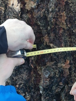 Palasimme Kirjavalletolpalle vanhan kolmostien vartta pitkin ja Koneen ohitse ylös. Rauhankadulta poikkesimme tekemään vielä pari puun runkomittausta ja sieltäpä löytyi lopulta lihavin yksilö. Puolimatkan sakarihautausmaan kulmassa seisoo douglaskuusi, jonka ympärysmitaksi saatiin peräti 281 cm. Kuusikisan voittaja oli siis Sveitsinpuistossa mitattu ikikuusi. Että eikö muka? No, lehtikuusi ja douglaskuusi ovat nimestään huolimatta mäntykasvien kasviheimoon kuuluvia.