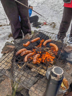 Siinä eväät ja juomat hupenivat makkaroiden käristessä tulella. Sinikalle taas kiitos makeasta leivonnaisesta.