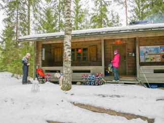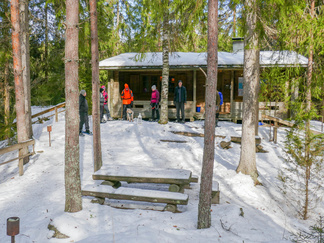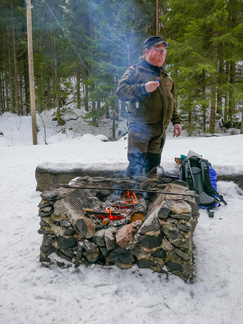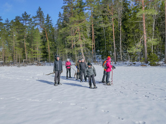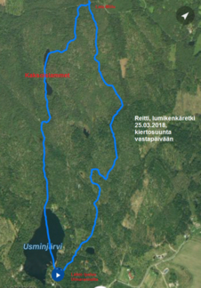 Lumikenkäretkeilymme jatkuivat retkellä aurinkoiseen Usmiin. Ajelimme autoilla jälleen kaupungista Usmin uimarannan parkkipaikalle, jossa laitoimme lumikengät jalkaamme. Kävelimme alkumatkalla keväisessä säässä ohi Pikku-Usmilammen ja ennen partiolaisten majaa ylitimme Usmin lenkkinä tunnetun hiihtoreitin siirtyen Pikku-Karhulammen ja Suoniityn väliseen maastoon. Kiertelimme harvemmin kuljettuja kallionvälejä hyväksikäyttäen vanhaa polunpohjaa pitkin kohti Aarinnansuota. Poikkesimme kuitenkin Aarinnansuolle johtavalta polulta sivuun suunnaten suoraan kohti Latu-Miilua. Lunta oli maastossa riittävästi, jotta saatoimme kierrellä pahempia risukoita. Vaikka sää oli lämmennyt plussan puolelle, aiemmin kantavaksi jähmettynyt hanki ei pettänyt lumikenkien alla. Latu-Miilun kanttiinissa nautimme virvokkeita ja laavulle tehtiin tulet eväsmakkaroiden käristämiseksi. Paluumatkalla kuljimme alakautta Kaksoislammille ja ylitimme molemmat lammet jäitä pitkin poikkeamatta nuotiopaikalle. Suunnistimme Usminjärven pohjoispään kautta Usminjärven jäälle ja siitä jään ylitse uimaranna parkkipaikalle, lähtöpaikkaamme. Retkelle osallistui kahdeksan henkilöä ja Ekku-koira. Matkamittarimme kertoi vajaan kuuden kilometrin lenkistä ja kesäaikaa tuohon retkeen kului 3,5 tuntia.