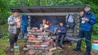 Ehdimme ja kastuakin matkalla, laavulle tulet, vaatteita vaihtoon eväitä syömään. Rannassa oli isoja lehtipuita ja pähkinäpensaita, laavut alueella olivat aika pienikokoisia, puuhuoltoa ei ollut, onneksi olivat omat puut följyssä. Muutenkin taukopaikat olivat hieman eri tasoa, kuin muutama viikko aiemmin Hiidenveden hienot taukopaikat.