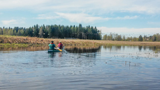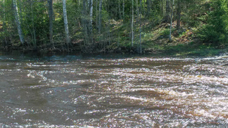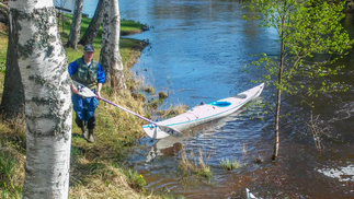 Tuulensuunjoen myötävirta kuljettikin meitä vauhdikkaasti, tulomatkan vääntöä vaativat virtapaikat menivät hujauksessa ohi. Kernaalanjärvellä oli pieni sivumyötäinen tuuli, mutta se Räikälänjoki. Normaalisti rauhallinen pikkuvirta, nyt vettä tulvillaan, löytyihän täältäkin virtauksia. Alkumatkalle ei virtausta huomannutkaan myötävirtaan mennessä. Eli lopussakin tuli sitä vääntöä. Melontamatkaa tuli 30 km ja autoilua rapiat 80, eli kanootit saivat kyytiä niin vedessä kuin autonkin katolla.