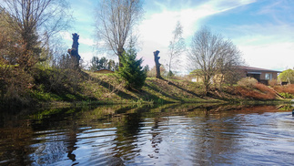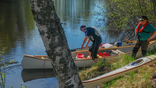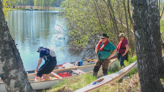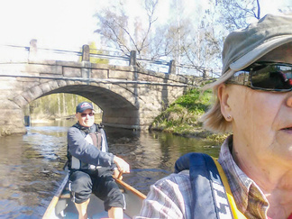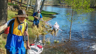 Takaisintulomatkalla odotimme virtaavaa vettä, mutta ensin oli taas sen pohjapadon ohitus, ”pikku-Matti” pujahti padon reunasta tulvaveden ansiosta sujuvasti, Mauno perässä ja pieni pohjakosketus, me muut ”roudasimme” kanoottimme maan kautta.