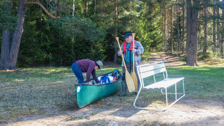 Mutta mepä läksimme aamusta Janakkalaan, kohtauspaikkana Pyhän Laurin kirkon P-paikka. Aamulla pähkäilimme mahdummeko 5 h Jukan autoon ja peräkärry perään vai otammeko 2 autoa. Jukka ratkaisi tilanteen, läksimme 3 autolla, kaikissa kanootti katolla. Oli jo valmiina. Yhdistyksen kanootit jäivät kyljelleen köllöttämään kanoottiparkkiin. Kirkolla odotteli ”pikku-Matti” kajakkinsa kanssa ja rannassa toinen Matti myös oman kajakkinsa kanssa.