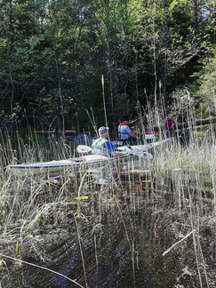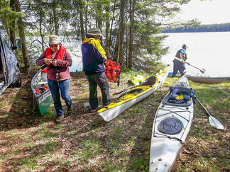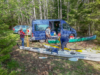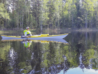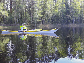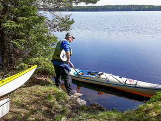 Keli oli kohdallaan, aamusta lämpöäkin sopivasti ja järvi aivan tyyni. Kalusto vesille, yksi avokaksikko ja kolme kajakkiyksikköä, tälläkin kertaa ilman peräkärryä, reteesti kolmella autolla.