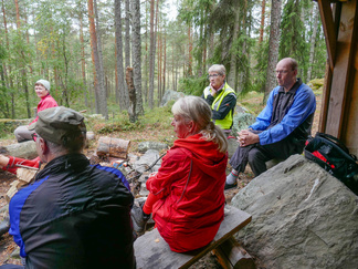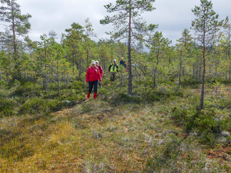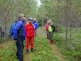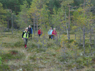 Pyöräilimme yhdeksän hengen joukolla Suomieheen. Kolmella henkilöllä oli sähköpyörät ajettavana. Alepan parkkipaikalla totesimme, että kumisaappaita löytyi lähes kaikilta. Aamu oli kostea ja sumuinen. Ajelimme Tuulikinkatua alas ja jatkoimme matkaa metsän siimeksessä pyöräteillä ja Ali-Anttilantiellä. Jalavan kohdalta ylitimme Uudenmaan kadun ja jatkoimme Hyvinkäänkylän kautta Noppoon ja edelleen Jätinlinnan seurantalolle. Kaikki osallistujat halusivat lähteä suolle kävelemään. Hämähäkin seitit kimaltelivat tienvarsilla ja suolla. Markku selvitti hienosti itsensä kastelematta jalkojaan Hanhisuon läpi ”saarekkeelle”. Laavulla jutustelimme ja söimme eväitä. Kävimme myös saarekkeen toisella puolella ihailemassa maisemaa. Suo alkaa jo saada ruskanvärejä. Sammaleet alkavat punertaa ja heinät kellertävät. Maistelimme karpaloita ja totesimme, ettei vielä ole kiirettä karpaloon. Paluumatkalla löytyi vielä hyviä tatteja, rouskuja ja kanttarelliäkin. Takaisin pyöräilimme auringon paisteessa samaa reittiä. Ilma oli lämmin. Osallistujat kiittelivät ja olivat tyytyväisiä retkeen. Pyöräily ja kävely yhdistelmä toimi ainakin tällä kertaa.