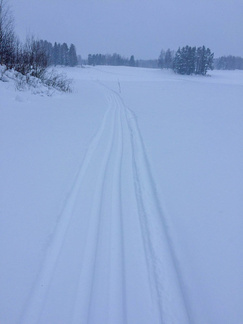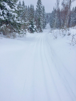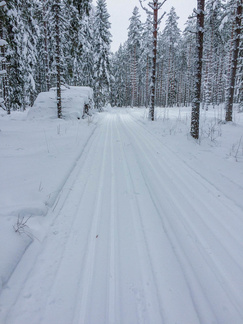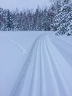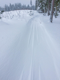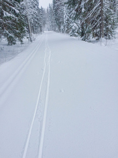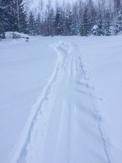 Lähdin katsomaan pitäisikö se Kiistaveikkojen kelkkakuskin edellisenä päivänä antama lupaus paikkansa, että hän ajaa reitin Kiistaveikoilta Erkylään aamulla, mikäli lunta tulee enempi yöaikaan. Siinä kohtaa, jossa latureitti eroaa Erkylän majan verkostosta, oli kuin olikin melko tuoreet kelkan jäljet. Valinta oli siis sangen helppo lähteä jatkamaan suunnitellulla reitillä kun täältä kuitenkin löytyi tuore, ajettu latu. Lenkin loppupuolella kävi ilmi, ettei Hyvinkään kaupunki ollut lainkaan käynnistänyt latukoneitaan tänä päivänä, joten lähiseudun parhaat ladut olivat varmasti allani.