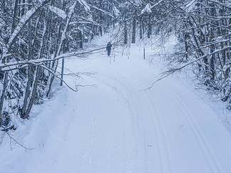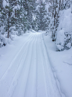Reitin varrella oli sellainen erityispiirre, että siellä täällä iltapäivällä tuulenpuuskat ja lämpenevä ilma saivat puiden lumikuorman lähtemään liikkeelle. Valitettavasti en sellaista lumiverhoa onnistunut kuvaamaan, vaikka muutaman kerran vastaavan pilven halkaisinkin.