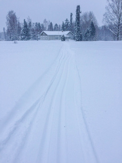 Rutikan tien ylityksen jälkeen tuli yksi hiihtäjä vastaan, joka ei kuitenkaan virkannut mitään. Muuten sain yksikseni nautiskella Hyvinkään ja Riihimäen välisen metsäkaistaleen erämaisuudesta. Oman Kodin pelloilla oli tietenkin parissa kohtaa tuiskuttanut latu-uran umpeen. Suunnistuksen apuna olivat kuitenkin ladun varteen lyödyt risut, joista kelkkakuski edellisenä päivänä mainitsi. Oman kodin jälkeisillä pelloilla tuli samainen, Päivin kuorokaveri Raikku, vastaan, joka myös kaksi viikkoa aikaisemmalla reissullani noilla haminoilla minua tervehti. Hän vahvistikin minulle hiihtelevänsä lempireitillään. Tämä saksalaista alkuperää oleva hiihtäjä valisti minua myös Monnin hiihdosta, joka on kuulemma päätetty pitää helmikuun 24. Ilmeisesti reitti tullee ylettymään aina Hikiän koululle asti. Valitettavasti meillä on samana päivänä tuo kaupungin kiertävä laturetki, jolloin ainakaan minä en tuolloin Riihimäen suuntaa hiihtele.