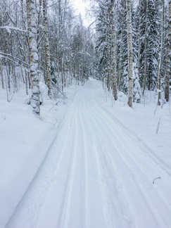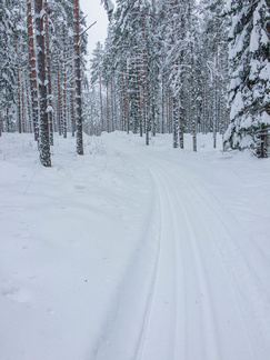 Aamulla lämpömittari näytti melkein viittä pakkasastetta, joten lähtiessä se havukeli oli vielä aika kaukana. Yön aikana oli pyryttänyt vain kaksi, kolme senttiä, mutta koska kaupunki ei ollut tänä aamuna laittanut latukoneitaan liikkeelle, piti hiihtäjän valita joko puoliksi ummessa ollut latu, tai sitten edellispäivän ajon jäljiltä tasainen keskikaista. Aika äkkiä se keskikaista tuli valituksi. Hiihtelin aivan kotirapulta aina lähtöpaikalle. Kun reissun aloittaa jo puoli yhdeksän korvilla, ei muita hiihtäjiä juuri liikenteessä näkynyt.