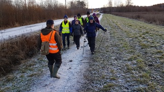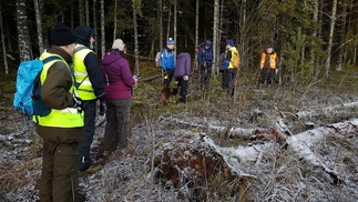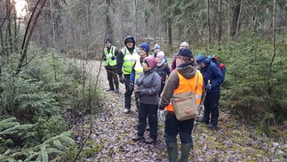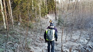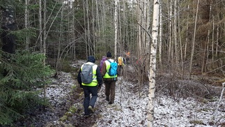 Keli oli sopiva pieneen päiväpatikointiin, sadepäivien väliin sunnuntaille osui hieman kuivempi päivä. Pientä pakkasta ja lumenrähmää aukeilla paikoilla. Meitä kerääntyi lähtöpaikalle hevostallien parkkiin 11 henkeä.