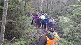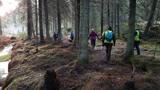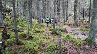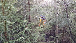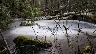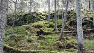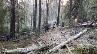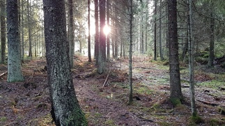 Maisema oli ylhäällä hieno, aukeilla oli hento lumipeite ja tiuhempi metsä sulana, aurinko paistoi. Matka jatkui pohjoiseen kohti Usmintien puomia. Metsä vaihtui vanhasta hakkuualueesta melkein ikimetsään ja taas hoidetumpaan talousmetsään.