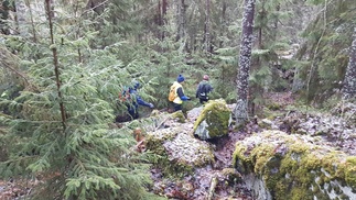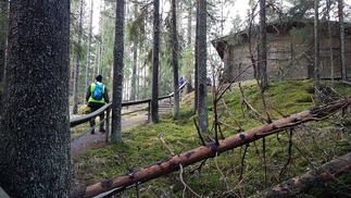 Metsään oikaisimme suoran päästä Mustan kiven vanhan louhoksen kautta, kuljimme vanhaa louhosradan pohjaa Huokolan autiotalon ja romuttamon välistä. Polku kapeni hyvän alun jälkeen tiuhaksi nuoreksi kuusikoksi. Nousimme ylös mäkeen vanhojen kiviaihioiden välistä ja taas oli hyvä kulukupoloku alla.