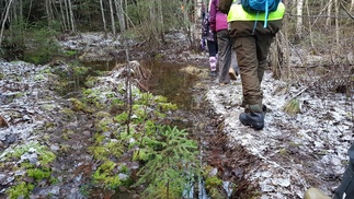Usmintien puomilla ”Anjan oja” virtasi voimakkaasti kuohuen, muuallakin ojat olivat täynnä vettä mutta maasto ei muuten ollut liian kosteaa, hyvin pääsi kulkemaan.