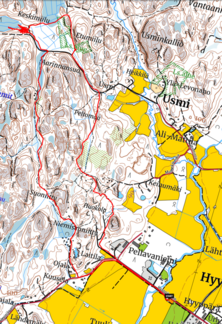 Paluumatka kulki Aarinnansuon kautta ulkoilureittiä ja eteenpäin omia polkuja Suoniityn ja Niemisenniityn reunoja louhoksen eteläpään kautta alas Usminjärventielle. Tielle laskeutuessa avautuu hieno maisema pelloille ja aurinko tietysti otti meidät vastaan metsän siimeksestä. Tieltä poikkesimme kuusiaidan päästä taas ulkoilutielle ja edelleen ”peltoparkkiin”.