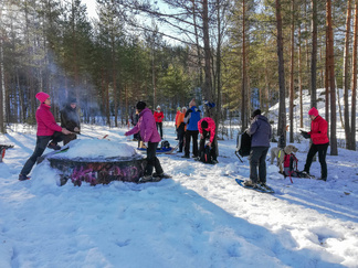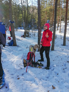 Lumikenkäretki Sonninmäen maastossa on jo perinne, joka aloittaa talviset lumikenkäilymme. Kokoonnuimme Puolimatkan koulun kentän reunaan aamukymmeneltä aurinkoisena pakkasaamuna 12 henkilön joukolla. Retkelle lähtijöiden joukossa oli pääosin tuttua väkeä, mutta paikalle saapui myös kaksi rouvaa, jotka eivät aikaisemmin olleet tämänkaltaista liikuntamuotoa kokeilleet.
