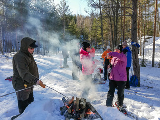 Kiertelimme Uudenmaankadun läheisessä osassa puistometsää ja siellä, laakeassa supassa kokeilimme, kuinka laskeutuminen rinnettä alas- ja ylöspäin sujuu. Suuntasimme kengänkärjet Hankopaanan läheisyydessä olevalle sorakuopalle. Kalevi oli tuonut sinne klapeja ahkiollaan ja tehnyt valmiiksi tulet sorakuopassa olevan betonirenkaan päälle. Pääsimme evästelemään ja paistoimme nuotiolla makkaroita.