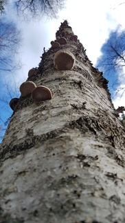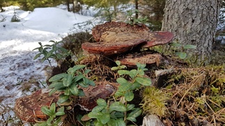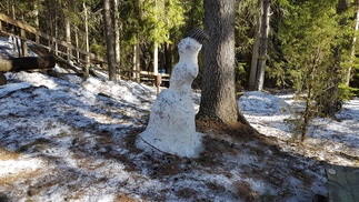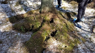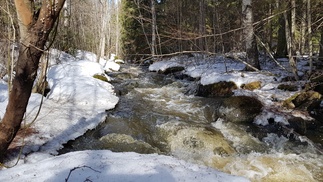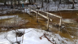 Kenkäilimme ylemmäs aurinkoisempaan maastoon ja sieltä reittiä alas Paalijoen sillalle, tulikin pieni mietintätauko. Jääpadot olivat nostaneet vedet sillan yli, olisi täytynyt kahlata vedessä siltaa pitkin, saappailla olisi ehkä päässyt. Käännyimme takaisin, kuljimme hieman alempana takaisin tulomatkan sillalle ja taas yli, siltä matka eteni yli vanhan myrskyn aikoinaan kaataman puusokkelikon yli, olivat jo muutamassa vuodessa painuneet kasaan.