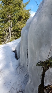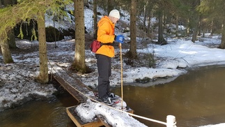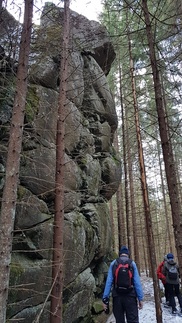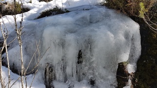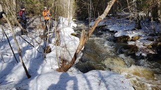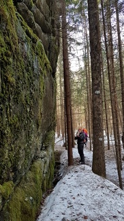 Kengät jalkaan ja reput selkään, suunta kohti Usminkalliota , siitä se retki lähti käyntiin. Kanjonissa katsastimme Paalijoen tulvivaa uomaa ja kuohuvaa koskea. Joki tulvi oman jääkerroksensa päällä. Matka jatkui jokea seuraten kohti luodetta, ylitimme virran Rastin polkujuoksureitin siltaa pitkin, hyvin sujui. Tarkoitus oli kulkea joen pohjoispuolta 7-veljeksen reitille ja sen siltaa taas yli ja edelleen luoteeseen joen toista puolta.