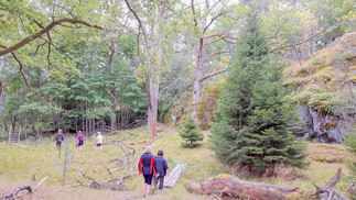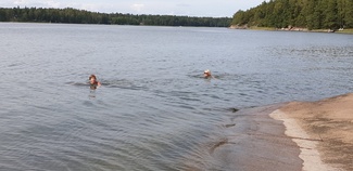 Bjursin jälkeen meloimme edelleen länteen ja rantauduimme kalliosaarelle tauolle. Pari ”tytärtä” tunsivat tarvetta heittäytyä veteen ja kiersivät saaren uiden. Heille tuli siis kahden saaren kierto, toinen uiden, toinen meloen.