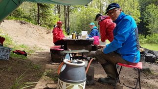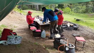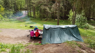 Aamulla, kello kymmenen nurkilla lähdimme kotoa Piilolammille sateen saattelemana. Uudenmaan virkistysalueella, ensimmäiselle nuotiopaikalle rinteeseen virittelimme tarpin sateensuojaksi. Sade oli lakannut, eivätkä hyttyset kiusanneet pahemmin. Roudasimme kaasupullon ja muut letunpaistotarvikkeet paikoilleen. Sytytimme nuotion ja kuinka ollakkaan, ensimmäiset latulaiset saapuivat mäkeä ylöspäin, eräs heistä käyttäen rollaattoria. Tapahtumapaikka olikin sopiva niin perheille, kuin vanhemmallekin väelle. Aamuinen sade ei ollut siis pelotellut kaikkia ulkoilijoita. Paistelimme muurinpohjalettuja ja rupattelimme niitä näitä. He lähtivät jatkamaan matkaa Piilolammin rantaan ja poikkesivat taas paluumatkalla. Metsä oli heille tuttu paikka. Sitten saapui kolmihenkinen perhe, jolta saimme luonnon kukkakimpun (kevätlinnunhernettä, kieloja, mustikanvarpuja ja heinää). Perhe oli keräilemässä kuusenkerkkiä tehdäkseen niistä siirappia. Jasa tuli pyöräillen katsomaan, miten selviydymme urakasta. Yhden maissa olimme lopettelemassa, mutta vielä saapui virkeä isovaari lapsenlapsenlapsen kanssa tulille. Alkoi sataa. Pidimme tarpin alla sateensuojaa. Lettujen nauttimisen ja sateen päättymisen jälkeen he jatkoivat matkaa omalle retkelleen ja me purkasimme ”leirin” ja lähdimme hyvillä mielin kotiin. Kahden litran lettutaikinasta jäi puoli litraa taikinaa paistamatta. Kävelyretkeä meidän ei tarvinnut tehdä koska osallistujat olivat omatoimisia. Lämpötila noin 10 celsius astetta. Kaiken kaikkiaan ulkoilijoita ei näkynyt olevan liikkeellä kovinkaan montaa.