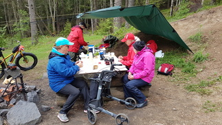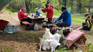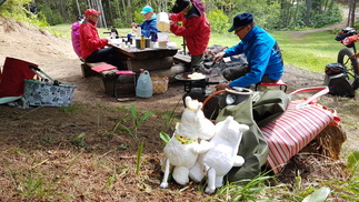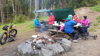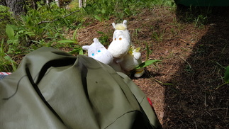 Aamulla, kello kymmenen nurkilla lähdimme kotoa Piilolammille sateen saattelemana. Uudenmaan virkistysalueella, ensimmäiselle nuotiopaikalle rinteeseen virittelimme tarpin sateensuojaksi. Sade oli lakannut, eivätkä hyttyset kiusanneet pahemmin. Roudasimme kaasupullon ja muut letunpaistotarvikkeet paikoilleen. Sytytimme nuotion ja kuinka ollakkaan, ensimmäiset latulaiset saapuivat mäkeä ylöspäin, eräs heistä käyttäen rollaattoria. Tapahtumapaikka olikin sopiva niin perheille, kuin vanhemmallekin väelle. Aamuinen sade ei ollut siis pelotellut kaikkia ulkoilijoita. Paistelimme muurinpohjalettuja ja rupattelimme niitä näitä. He lähtivät jatkamaan matkaa Piilolammin rantaan ja poikkesivat taas paluumatkalla. Metsä oli heille tuttu paikka. Sitten saapui kolmihenkinen perhe, jolta saimme luonnon kukkakimpun (kevätlinnunhernettä, kieloja, mustikanvarpuja ja heinää). Perhe oli keräilemässä kuusenkerkkiä tehdäkseen niistä siirappia. Jasa tuli pyöräillen katsomaan, miten selviydymme urakasta. Yhden maissa olimme lopettelemassa, mutta vielä saapui virkeä isovaari lapsenlapsenlapsen kanssa tulille. Alkoi sataa. Pidimme tarpin alla sateensuojaa. Lettujen nauttimisen ja sateen päättymisen jälkeen he jatkoivat matkaa omalle retkelleen ja me purkasimme ”leirin” ja lähdimme hyvillä mielin kotiin. Kahden litran lettutaikinasta jäi puoli litraa taikinaa paistamatta. Kävelyretkeä meidän ei tarvinnut tehdä koska osallistujat olivat omatoimisia. Lämpötila noin 10 celsius astetta. Kaiken kaikkiaan ulkoilijoita ei näkynyt olevan liikkeellä kovinkaan montaa.