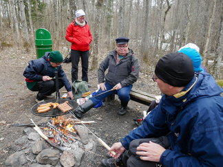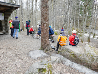 Nukarilla jätimme pyörät Vantaanjoen sillan pielessä olevalle parkkipaikalle klo 12.10. Iloksemme Kalevi oli siellä meitä vastassa. Tässä vaiheessa meitä olikin jo neljätoista. Jatkoimme matkaa jalkaisin laavulle, jossa paistelimme makkaroita ja hörpimme kahvit. Evästauon jälkeen tutustuimme koskialueeseen. Nukarinkoski kuohui ja kohisi pitkältä matkalta. Pitkospuiden kohdalla oli ”väritön” mustarasta. Klo 13.10 palasimme pyörille. Kalastuksen valvojan ominaisuudessa pari herraa kyseli meiltä mielipiteitä alueen kehittämiseksi. Aluetta oli jo kunnostettu ja lisääkin kunnostustöitä oli luvassa. Eniten meitä tuntui kiinnostavan, miksi koskialueella ei saa onkia eikä käyttää elävää syöttiä. Saimme ohjeen lukea kalastuslakia.