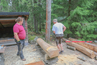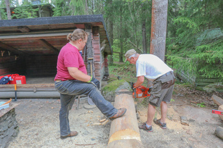Sahailimme aluksi moottorisahalla vanhat, jo lahonneet ja penkkeinä toimineet haapapöllit klapin pituisiksi pätkiksi. Projektia varten saimme toisenkin lahjoituksen, kun Jukka toi 6 kpl ylijäämäisiksi jäänyttä betonikourua asuintalonsa taloyhtiön varastosta. Asettelimme betonikourut anturoiksi penkkien jalkojen alle. Jaloiksi sahasimme majan tontilla olleista sähköpylväistä sopivan pituiset pätkät. Näiden päälle asettelimme saamistamme tukinpuolikkaista sopivan pituiset pölkyt. Veistelimme työkaluilla penkkiaihiot sopiviksi jalkojensa päälle ja kiinnitimme penkit jalkakappaleisiin pitkillä ruuveilla. Jukka pensselöi ruskealla puuöljyllä penkin päälliset ja viimeistelimme työmme haravoimalla roskat laavun ympäristöstä. Kottikärryllinen hiekkaa kärrättiin tukemaan penkin anturoina toimivia betonikouruja. Ylimääriset halkaistut kuusipöllit veimme alavarastoon sateensuojaan odottamaan tulevia käyttötarpeita.