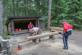 Päätimme jättää pätkityt haapapöllit laavulle, sillä puuliiteri on jokseenkin täynnä. Retkeilijät, jotka haluavat ja joilla on kirves mukanaan, voivat halkoa niistä polttopuita tulisijaan.