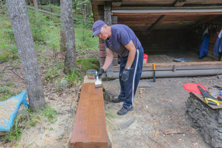 Sahailimme aluksi moottorisahalla vanhat, jo lahonneet ja penkkeinä toimineet haapapöllit klapin pituisiksi pätkiksi. Projektia varten saimme toisenkin lahjoituksen, kun Jukka toi 6 kpl ylijäämäisiksi jäänyttä betonikourua asuintalonsa taloyhtiön varastosta. Asettelimme betonikourut anturoiksi penkkien jalkojen alle. Jaloiksi sahasimme majan tontilla olleista sähköpylväistä sopivan pituiset pätkät. Näiden päälle asettelimme saamistamme tukinpuolikkaista sopivan pituiset pölkyt. Veistelimme työkaluilla penkkiaihiot sopiviksi jalkojensa päälle ja kiinnitimme penkit jalkakappaleisiin pitkillä ruuveilla. Jukka pensselöi ruskealla puuöljyllä penkin päälliset ja viimeistelimme työmme haravoimalla roskat laavun ympäristöstä. Kottikärryllinen hiekkaa kärrättiin tukemaan penkin anturoina toimivia betonikouruja. Ylimääriset halkaistut kuusipöllit veimme alavarastoon sateensuojaan odottamaan tulevia käyttötarpeita.