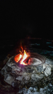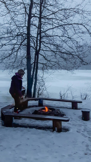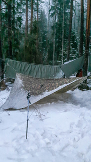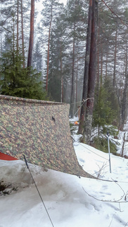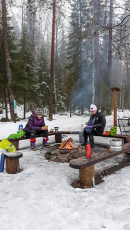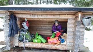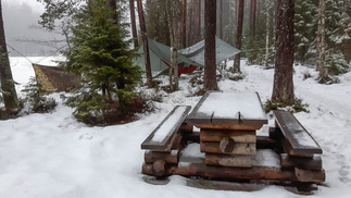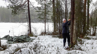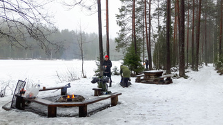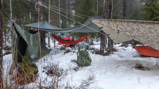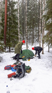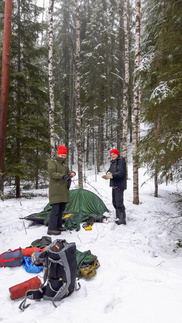 Seitsemän hengen ryhmä yöpyi Iso-Kypärälammen rannalla talviyön teltoissa ja riippumatoissa. Säätila ei oikein suosinut retkeilijöitä, sillä illasta aamuun satoi räntää ja vuoroin silkkaa vettä.