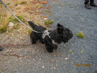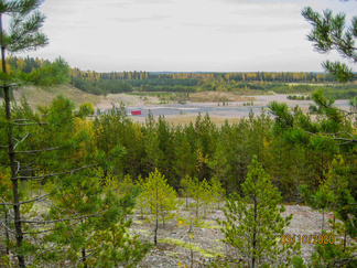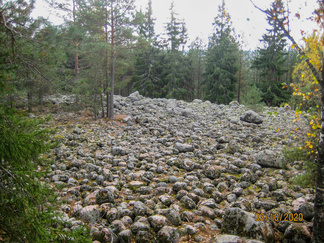 Saavuimme hyvässä järjestyksessä Jukan metsätien p-paikalle, jossa autoillen saapuneet meitä jo odottivat. Koko 18 henkilön ja yhden nelijalkaisen joukkomme asteli ihastelemaan Suomiehen ennallistetun soranottoalueen luontoa. Alueella on mahdollista kiertää opastauluilla varustettu luontopolku nousematta lainkaan harjujen päälle. Muutama henkilö valitsi tämän vaihtoehdon, jonka reitillä toki on nähtävillä kaksi ympäristötaideteosta. Ensimmäiseksi kulkija kohtaa polun varrella Riku Lumiaron ”Mennyttä aikaa etsimässä” teoksen. Kivilabyrintti on jatulintarha, jota reunoja koristamaan on asetettu vanhoja ikkunankarmeja, joiden ruudun läpi näkyy eläinten luita. Taitaapa labyrintin kaivossa olla muinainen valaan selkänikamakin! Alueen keskivaiheilla on Vilma Pylkön ympäristötaideteos, kivistä rakennettu Jätin jalanjälki. Parhaiten jalanjälki erottuu, kun malttaa nousta polkua pitkin harjun päälle.