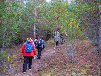 Lauantaina 03.10. tehtiin yhdessä Hyvinkään sydänyhdistyksen kanssa Ruskaretki Suomiehen luontopolulle. Puolet osallistujista varustautui kulkemaan retken polkupyörillä ja toinen puoli, 9 henkilöä suoriutui matkasta autokyydein. Polkupyöräilijöiden yhteislähtö oli aamukymmeneltä Puolimatkan koululta, kimppakyytiläiset lähtivät matkaan Onnensillasta puoli tuntia myöhemmin. Matka Suomieheen, Jukan metsätien P-paikalle pyöräillen Nopon kautta oli n. 11 kilometrin mittainen. Ajelimme lähes koko menomatkan käyttäen kevyen liikenteen väyliä, joten matkanteko oli turvallista. Sää oli mainio ja vaikka ilmakin oli erinomainen, ainoastaan yhden kerran pumppasimme sitä Kattopeitteentien kohdalla ja vain yhden retkeläisen renkaisiin.