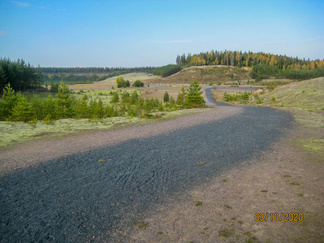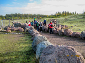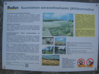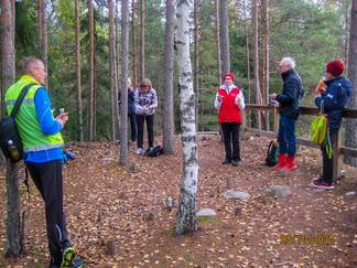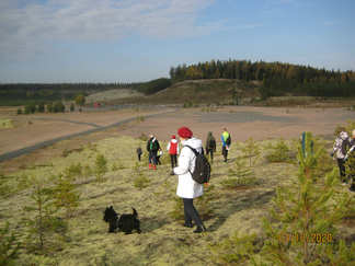 Saavuimme hyvässä järjestyksessä Jukan metsätien p-paikalle, jossa autoillen saapuneet meitä jo odottivat. Koko 18 henkilön ja yhden nelijalkaisen joukkomme asteli ihastelemaan Suomiehen ennallistetun soranottoalueen luontoa. Alueella on mahdollista kiertää opastauluilla varustettu luontopolku nousematta lainkaan harjujen päälle. Muutama henkilö valitsi tämän vaihtoehdon, jonka reitillä toki on nähtävillä kaksi ympäristötaideteosta. Ensimmäiseksi kulkija kohtaa polun varrella Riku Lumiaron ”Mennyttä aikaa etsimässä” teoksen. Kivilabyrintti on jatulintarha, jota reunoja koristamaan on asetettu vanhoja ikkunankarmeja, joiden ruudun läpi näkyy eläinten luita. Taitaapa labyrintin kaivossa olla muinainen valaan selkänikamakin! Alueen keskivaiheilla on Vilma Pylkön ympäristötaideteos, kivistä rakennettu Jätin jalanjälki. Parhaiten jalanjälki erottuu, kun malttaa nousta polkua pitkin harjun päälle.