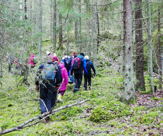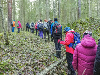 Lähtijöitä kerääntyi yhteensä 21 henkeä Järvenpään Ladun vahvistuksilla, siitä syntyi mukava letka, kun alkuinfon ja nimienkeruun jälkeen lähdimme taivaltamaan. Syttypuut, vettä ja kahvipannu tarpeineen kulkivat mukana, omavaraisia kun ollaan.