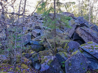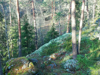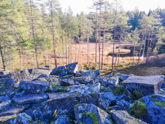Kiersimme Iso-Karhulammen pohjoispuolelta kohti Aarinnansuon eteläpäätä, nousimme ylös mäkeen ja oikaisimme Suoniitylle, mistä notkoa etelään. Ennen ulkoilureittiä käänsimme selän auringolle ja nousimme Pikkukarhulammen itäpuolen kallioille ja sieltä Iso-Karhulammelle nokeamaan kahvipannua.