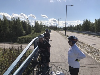 Me jatkoimme kevyenliikenteen väylää lentokentän sivuitse. Osuimmekin melkoiseen lentosumaan, sillä näimme kaksi siivekästä peräjälkeen nousukiidossa ja kolmannen kohta päiden yläpuolella laskeutumassa jo samoille sijoille. Pohjoisella ohikulkutiellä ohitimme muun muassa Golf-kentän, jonka lähin tii oli aivan tien alapuolella, jolloin pari napakkaa iskua sai jo etupyöräilijän tarkistamaan, menikö joltain rengas. Retkeläisemme kuitenkin paahtoivat mäkeä ylös entisellä draivilla!