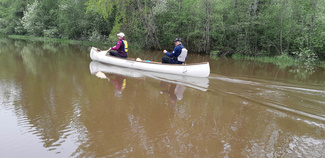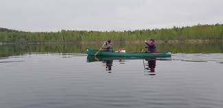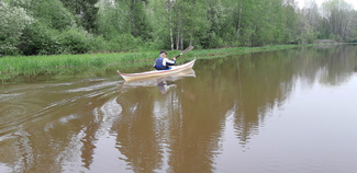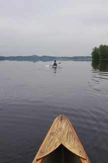 Nuotion sammutuksen jälkeen tavarat takaisin kanootteihin ja läksimme oikomaan takaisinpäin kohti Leppäkoskea, muuta vesiliikennettä ei tullut vastaan kumpaankaan suuntaan mennessä. Mökkiläisiä oli pihoilla jonkun verran ja lintuja oli liikenteessä, joutsenia, kurkia ja sinisorsia, kaartelevia haukkojakin havaitsimme neljän ryhmän.