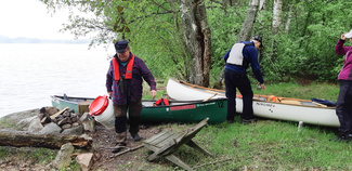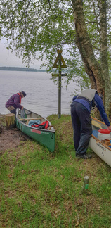 Järvi oli tyyni ja aamu utuinen, kaarsimme Hiisinkärjen rantautumispaikalle tauolle. Vesi oli sateiden jälkeen korkealla ja rantautumispaikankin hiekkaranta veden alla.