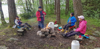 Nuotio pystyyn ja keittelimme nokipannukahvit eväiden syönnin lomassa, puut ja vesi kulkivat tietenkin mukana, kanoottiin mahtuu. Makkaratkin käristeltiin, maltoimme odottaa kunnon hiillosta.