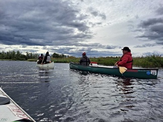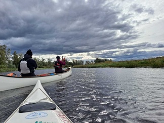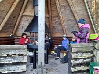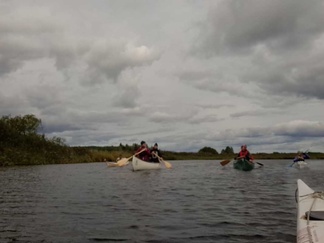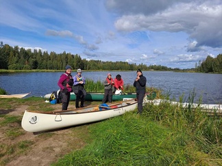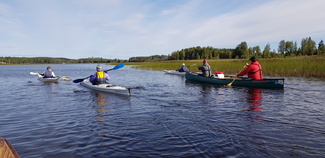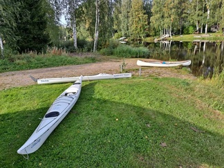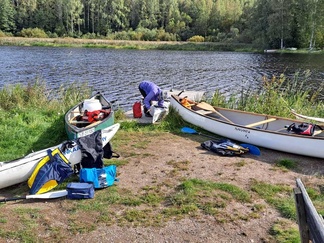 Mommilan järven soutustadionilla (Mommilan järven kirkkovenesoututapahtuman pitopaikka) rantauduimme ja pidimme rantakodassa eväs- ja makkaranpaistotauon. Matkalla tuli yksi uisteluvene vastaan, muuten oli hiljaista ja autiota.