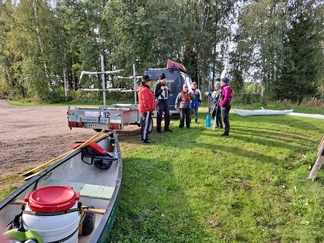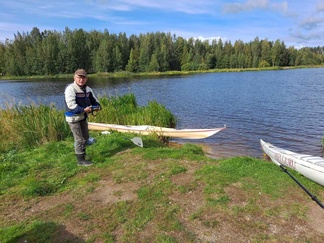 Matti odotteli rannassa, muita ei näkynyt liikenteessä. kalustorantaan ja varusteet mukaan, suuntana Mommilan järven soutustadion.