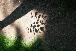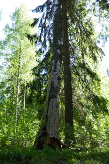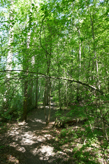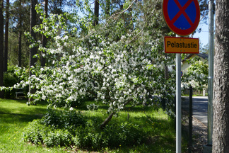 Saavuimme Sonninmäkeen ja kuljimme Lehtosen puutarhan halki. Lehtosen Kauppapuutarha toimi Puolimatkan alueella 1920-luvulta aina 1970-luvulle asti. Vanhojen omenapuiden runsas kukinta tuntui ihmeelliseltä. Havaitsimme myös puiden alla käyskentelevän peuran ja ikivanhan koivun kyljessä olevasta reiästä kuului tikanpoikien kiljunta. Emolintuja ei havaittu, mutta nälkäisten poikasten ääni paljasti pesinnän.