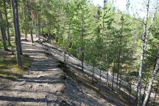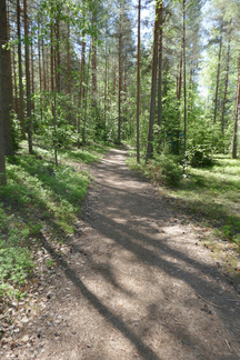 Palailimme Hyvinkäänkylän työväentalon ohitse kohti Pilvenmäkeä, Tuomentien päähän. Tuo matka on mahdollista kulkea kapeassa metsäkaistaleessa ja siitä kaupunkiin päin kuljettaessa voi tallustaa Puolimatkan koulun kentän reunaan asti oikeassa metsässä. Muutama kadunylitys on toki välissä.