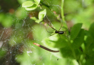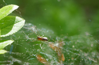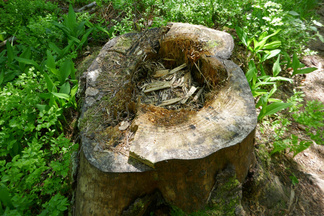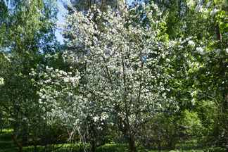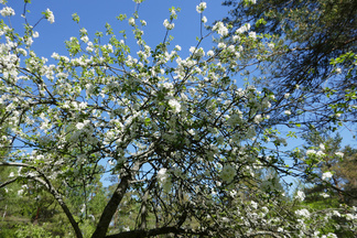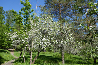 Saavuimme Sonninmäkeen ja kuljimme Lehtosen puutarhan halki. Lehtosen Kauppapuutarha toimi Puolimatkan alueella 1920-luvulta aina 1970-luvulle asti. Vanhojen omenapuiden runsas kukinta tuntui ihmeelliseltä. Havaitsimme myös puiden alla käyskentelevän peuran ja ikivanhan koivun kyljessä olevasta reiästä kuului tikanpoikien kiljunta. Emolintuja ei havaittu, mutta nälkäisten poikasten ääni paljasti pesinnän.