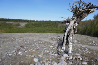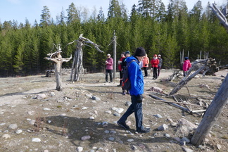 Olimme siis kuitenkin suuntaamassa Suomiehen luontopolulle, vaikka vaihtoehtoiset paikat vaikuttivat mielenkiintoisilta. Polku alkaa mukavasti aivan P-alueen kohdalta. Luontopolkureittejä on kylläkin itseasiassa kaksi. Alempana kulkeva reitti on helppokulkuinen ja sen pääsee kiertämään huonojalkaisempikin. Vaativampi reitti kiemurtelee soramontun reunassa olevaan metsään ja vie ylös Jätinkadulle. Tutustuimme aluksi Riku Lumiaron ”Mennyttä aikaa etsimässä”- nimiseen teokseen. Jatulintarhaa muistuttavaan muotoon on asetettu suurehkoja ja pienempiäkin kivenlohkareita. Heinäseipäissä roikkuvia vanhanmallisia ikkunanpokia on asetettu kivirivien laidalle. Ikkunaruuduissa puolestaan roikkuu eläinten luita ja sarvia. Onpa jatulintarhan sydämeen asetettu luultavasti valaan selkärangasta irrotettu nikama. Eräänlainen metsästäjä- kalastaja heimon palvontapaikka kenties?