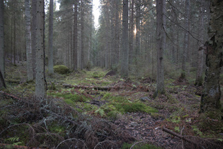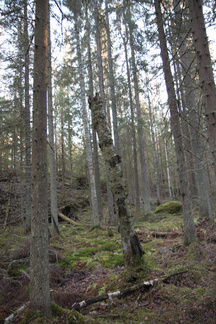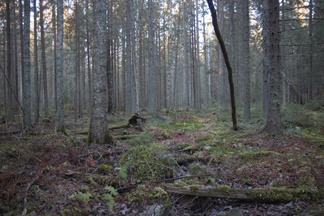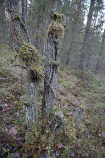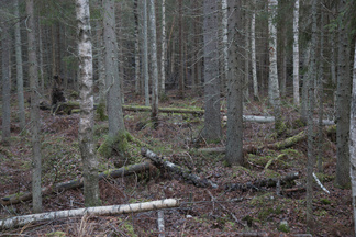 Myös maasto alkaa jo näyttää vanhalta metsältä, kaatuneita puunrunkoja makaa maassa jo osittain maatuneena ja myös pystyyn kuolleita runkoja on useita. Toinen kohteemme oli Piilolammen polun risteyksessä, myös tässä on runsaasti maatuneita puunkaatoja ja pystyyn kuivuneita runkoja. Hieman samanlaista jälkeä kuin majavan tekemän padon jälkeen.