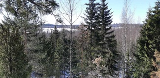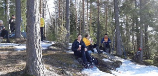 Sillanpäästä menee ura harvahkoa metsää ylös mäen päälle. Siellä ”rensselit santaan” ja evästauolle, aurinko paistoi istuskellessamme kalliolla. Näkymää oli varsinkin etelän suuntaan, ”Bongasimme” mm Karlbergin tilan kerrostalon Petkelsuon takana Herusten rinteessä.