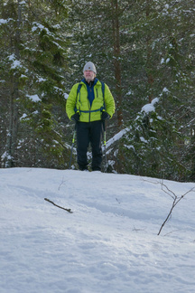 Sovittelimme lumikengät jalkaan ja suuntasimme askeleemme Sonninmäkeä kohti, ja pian olimme alueen sydämessä. Noin 40 hehtaarin laajuisella yhtenäisellä alueella risteilee lukuisia polkuja myös talvisaikaan. Useat muutkin ulkoilijat liikkuvat Sonninmäellä, -useimmat hiihtäen, nauttimassa mäntymetsän tuoksuista ja varsin hiljaisesta ympäristöstä. Metsässä oli runsaasti lunta, olihan edellisviikolla ollut kahtena päivänä kova myräkkä. Suojasään jälkeen saapuneen pakkasen hyvä teko oli jähmettää satanut lumi mukavasti lumikengillä kulkevia kantavaksi. Ohitimme vesitornin ja laskeuduimme siitä suppaan. Jarmo oli liikkeellä Ladun liukulumikengillä, joilla hän sujautti vauhdikkaasti supan pohjalle. Suuntasimme kengänkärjet Hankopaanan läheisyydessä olevalle sorakuopalle. Kalevi oli tuonut sinne klapeja ahkiollaan ja tehnyt valmiiksi tulet sorakuopassa olevan betonirenkaan päälle. Pääsimme evästelemään ja paistoimme nuotiolla makkaroita.
